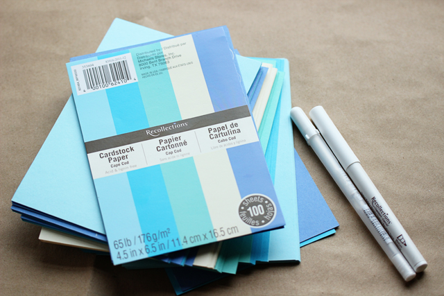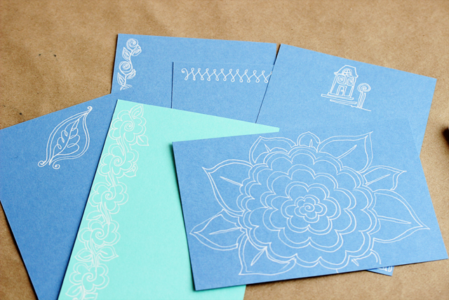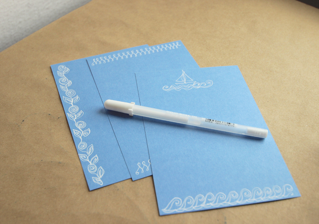 I found this card stock at my local craft store, Michaels. I know it is readily available online, in craft stores and in office supply stores. It comes in a wide variety of sizes and in many sumptuous color combinations. In addition to the card stock, all you need are a few white pens. I purchased a variety, but my favorite was the gel pen. It is thin and bright white.
