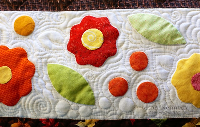 For the appliqué border, I closely echo-stitched around each shape and added embellishments like swirls, leaves, pebbles and more flowers.